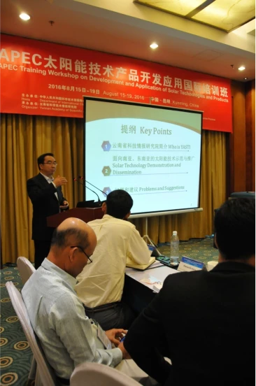 王蓉芳处长在致辞时说,面临全球资源紧张,环境问题日益严重的大环境下,节能环保及新能源的绿色发展动力成为亚太地区经济发展的重要动力。随着亚太区域一体化进程逐步推进,新能源的发展受到亚太各经济体的关注。近些年来,云南省科技厅、云南省科技情报研究院充分发挥云南省在太阳能开发利用的资源、技术和人才优势,通过国际科技合作,有力促进了包括太阳能在内的新能源与可再生能源的技术进步和产业化应用,取得了显著成效。当前,新能源产业还存在诸多问题,需要齐聚各方力量共同探讨解决之道,并在未来发展上达成共识。借此次培训班召开之际,希望各位学员能更多地了解亚太地区在新能源领域的科技发展,特别是中国云南在太阳能开发应用方面取得的进展;希望亚太地区各经济体可以携起手来,为共同应对能源危机和生态环境挑战,大力开展国际合作,取长补短,充分利用全球科技资源,实现人类的共同发展。