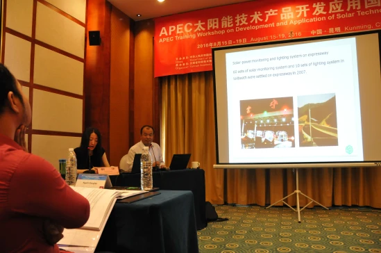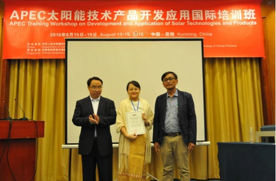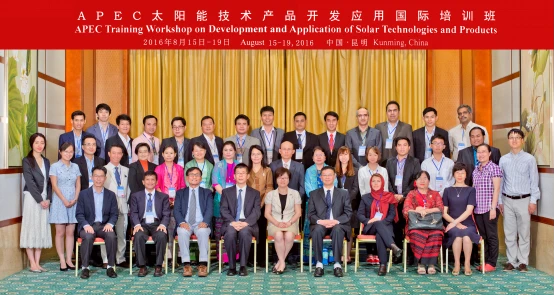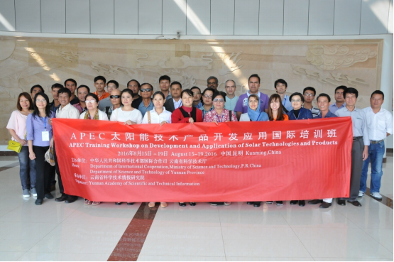 由中国APEC基金支持,科技部国际合作司和云南省科学技术厅主办,云南省科技情报研究院承办的APEC太阳能技术产品开发应用国际培训班于2016年8月15至19日在昆明成功举办。来自美国、菲律宾、印度尼西亚、泰国、越南、老挝、柬埔寨、缅甸、伊朗、中国等10个国家的31名学员参加了培训。8月15日上午,科技部国际合作司国际组织和会议处王蓉芳处长、科技厅对外交流与合作处黄科调研员出席开班仪式并致辞,省科技情报院邬平副院长主持了开班仪式。